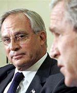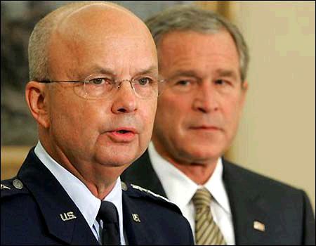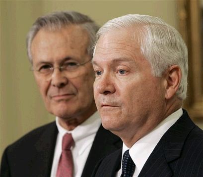 Image: Goss and Bush together at the CIA, back when they put up a fight for control of America's intelligence apparatus. President Bush originally placed Porter Goss in command of the CIA, and charged him with the task of rooting out the Rogue Weasels responsible for the leaks there (See The CIA in Deep QAQAA). However, after some anti-Goss innuendo once again created by MZM et al, and advising (possibly by Karl Rove and his people) Porter Goss was fired. Naturally Goss was replaced by a known Weasel. Since then the CIA has been uniformly unhelpful with more leaks and anti-Bush policy positions. With the CIA lost, the only intelligence operations intact were the military intelligence units under Donald Rumsfeld. Thus it is no surprise that Rumsfeld is being replaced by someone who is already on record as being against the expanded role of military intelligence. It is not enough for them to take the CIA: They also have to destroy any competing honest military intelligence service for America. Images: Goss gets canned, Hayden is installed in his place, and then Rumsfeld is canned and replaced by Gates, who is opposed to a major role for military intelligence. Thus every legitimate intelligence organization will soon be neutralized. The expressions on their faces say more than their words do.